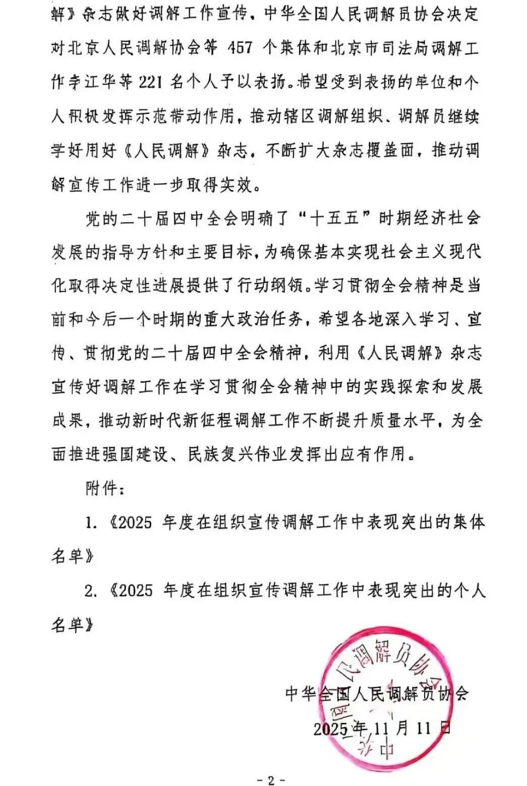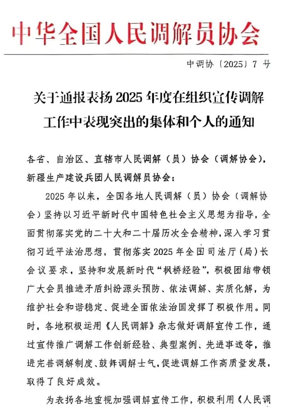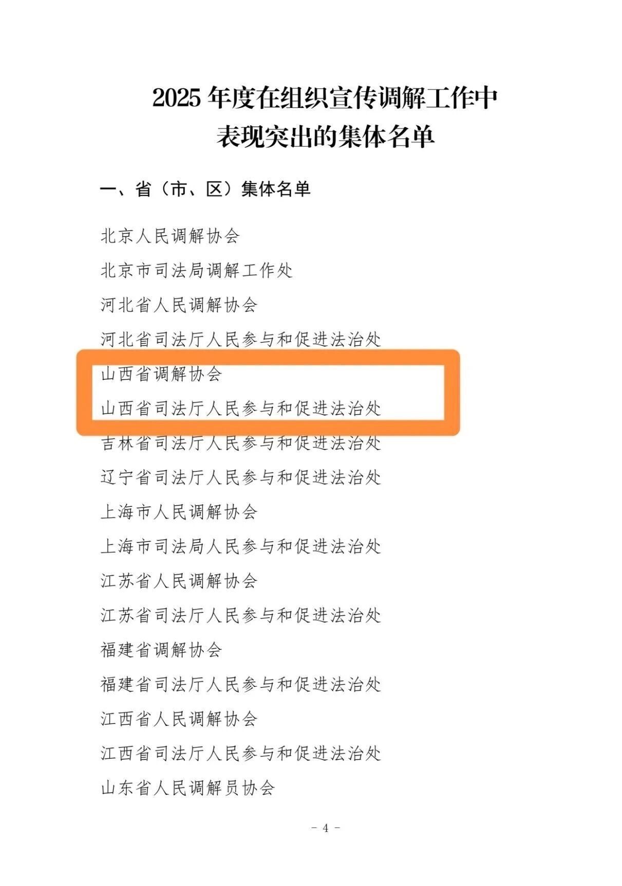 近日,中华全国人民调解员协会印发《关于通报表扬2025年度在组织宣传调解工作中表现突出的集体和个人的通知》,对在2025年度人民调解宣传工作中作出突出贡献的先进集体和个人进行通报表扬,山西省司法厅人民参与和促进法治处、山西省调解协会、晋城市高平市司法局、晋中市昔阳县司法局、运城市芮城县司法局、临汾市襄汾县司法局、晋城市阳城县司法局、阳泉市郊区司法局、阳泉市矿区司法局、阳泉市城区司法局获评“2025年度在组织宣传调解工作中表现突出的集体”。