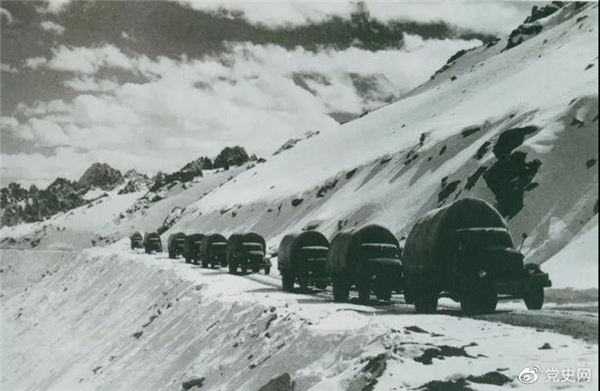 1954年12月,贯通”世界屋脊”的康藏、青藏两条公路全线正式通车。图为行驶在康藏公路上的车队。